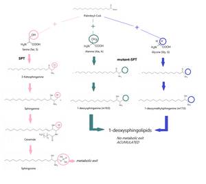 The 1-deoxysphingolipids (1-deoxySLs) are an atypical and recently discovered class of sphingolipids (SLs). They are formed during the nove synthesis pathway and their essential C1-OH deficit causes the malfunctions of the following transformations to achieve complex sphingolipids. In general, sphingolipids are formed during a reaction that is catalyzed by the SPT enzyme (serine-palmitoyltransferase) where the condensation of serine and palmitoyl-CoA takes place. The origin of this rare sphingolipid, though, is due to a defect of the SPT which can also use (as substrats) alanine or glycine. This change is what forms the 1-deoxySL.