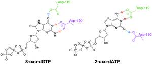 MutT enzymes in non-human organisms often have substrate specificity for certain types of oxidized nucleotides, such as that of E. coli, which is specific to 8-oxoguanine nucleotides. Human MTH1, however, has substrate specificity for a much broader range of oxidatively damaged nucleotides. The mechanism of hMTH1's broad specificity for these oxidized nucleotides is derived from their recognition in the enzyme's substrate binding pocket due to an exchange of protonation state between two nearby aspartate residues.